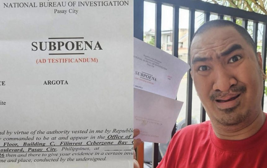 Sa isang Facebook post, ipinakita ni Argota ang larawan ng subpoena at sinabi niyang personal itong inihatid ng mga tauhan ng NBI sa kanilang bahay.