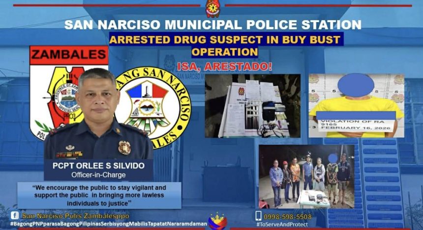 SAN NARCISO, ZAMBALES – Arestado ang isang lalaki matapos ang matagumpay na isinagawang buy-bust operation ng mga elemento ng San Narciso Municipal Police Station (MPS) nitong Lunes ng gabi, February 16, 2026.