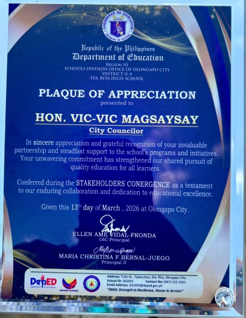 OLONGAPO CITY – Labis ang pasasalamat ni Konsi Vic-Vic Magsaysay matapos siyang bigyan ng pagkilala ng Department of Education (DepEd) Tayo ng Sta. Rita High School.